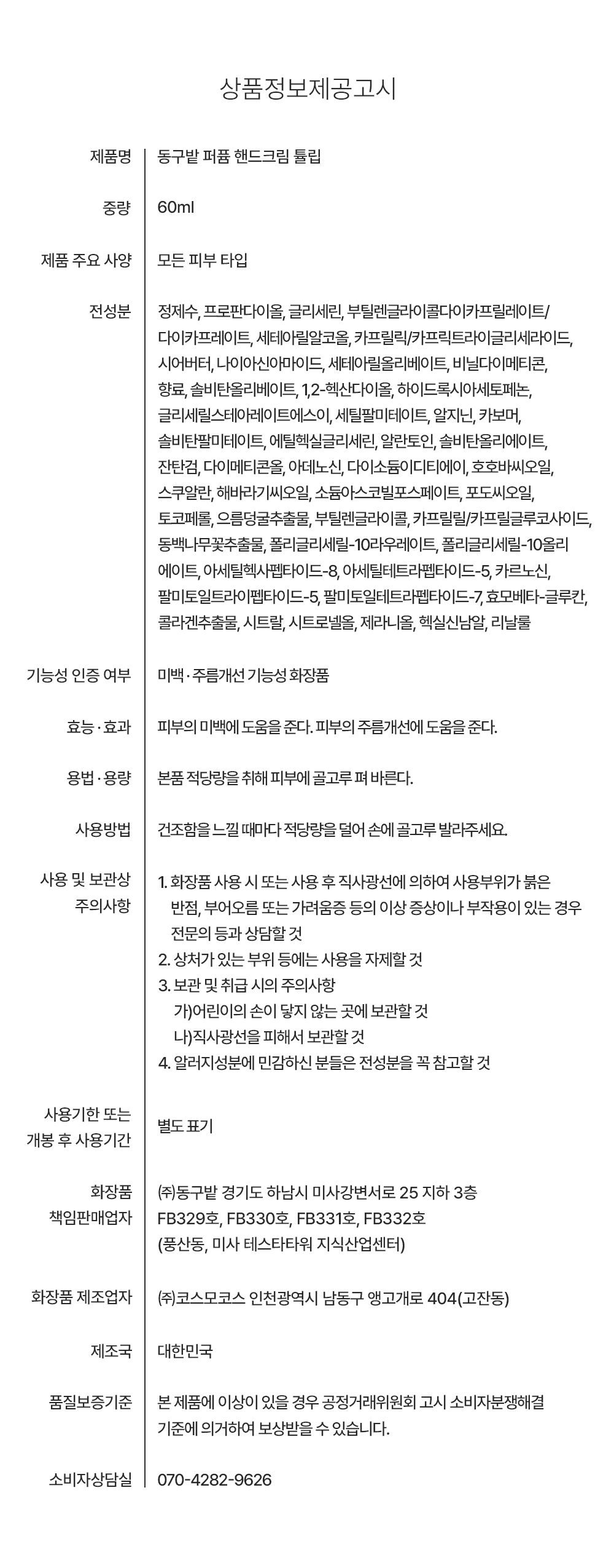 | 소비자상담 관련 전화번호 | 070-4282-9626 | ||
